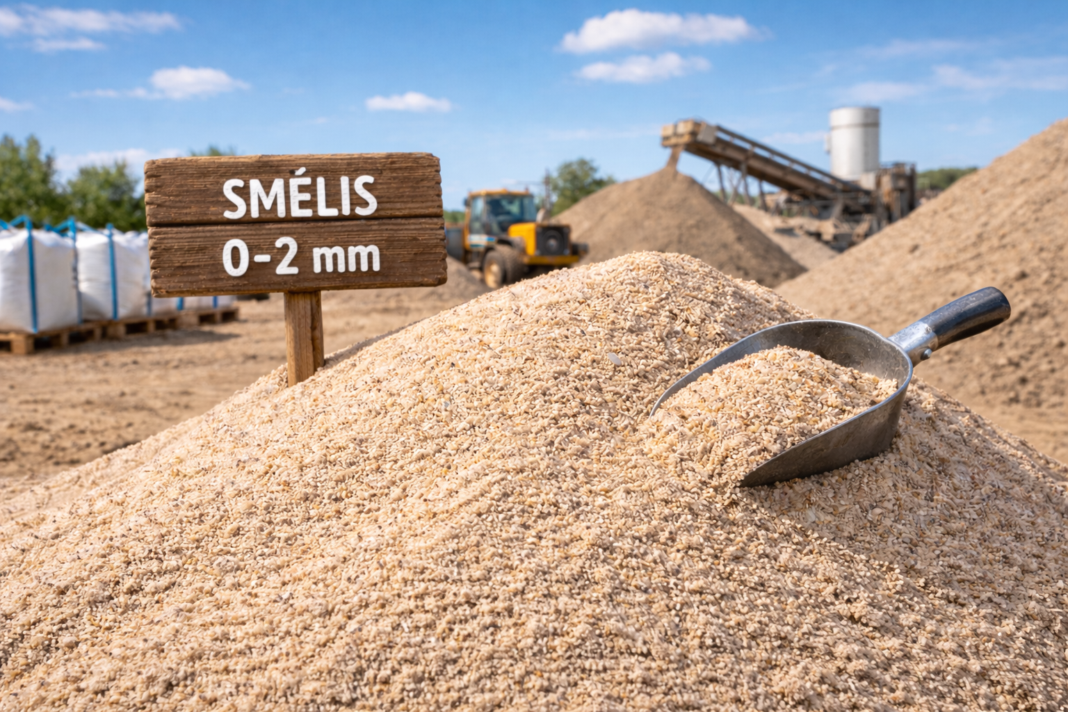 plaustas smėlis 0–2, smėlis tinkavimui, statybinis smėlis tinkui, smėlis skiediniui, smėlis didmaišiais, smėlio pristatymas Kaune.